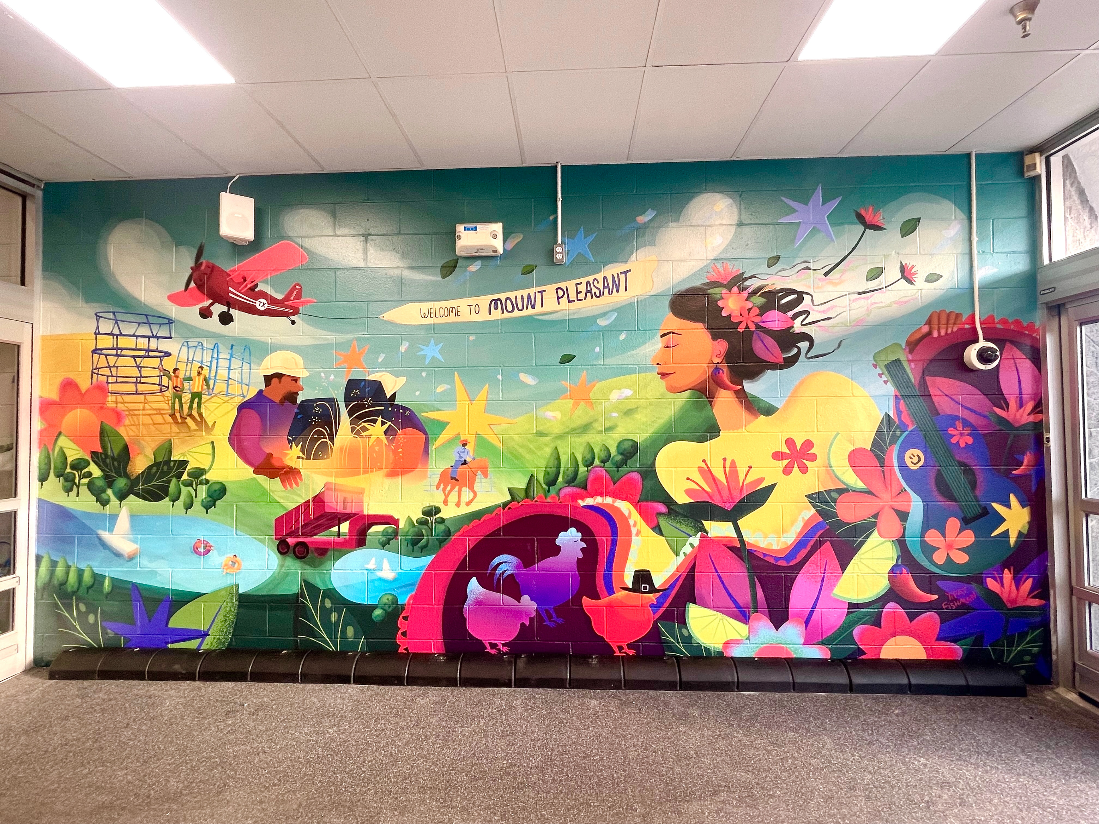Mural illustration for Walmart store in Mount Pleasant, TX located about two hours drive north-east of Dallas. The mural is a vibrant celebration of Mount Pleasant, designed to inspire and uplift. The artwork dynamically depicts the city’s industrial and agricultural heritage, as well as plentiful outdoors activities found at its nearby lakes. With a playful representation of the Mount Pleasant aviation museum, the artwork celebrates the community, fostering a sense of pride and unity.